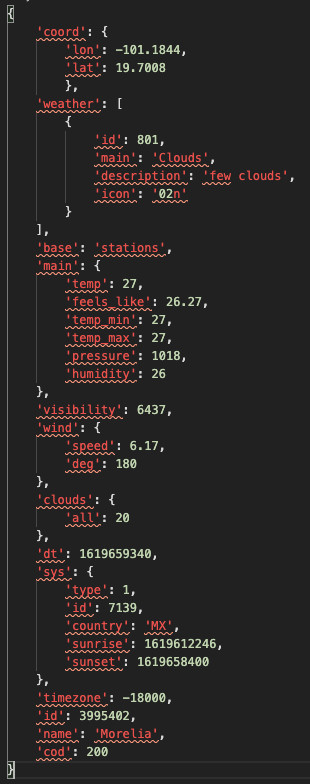 - El dato que regresa la API de OpenWeather es un JSON que contiene diferentes tipos de información acerca de la ciudad que solicitamos: